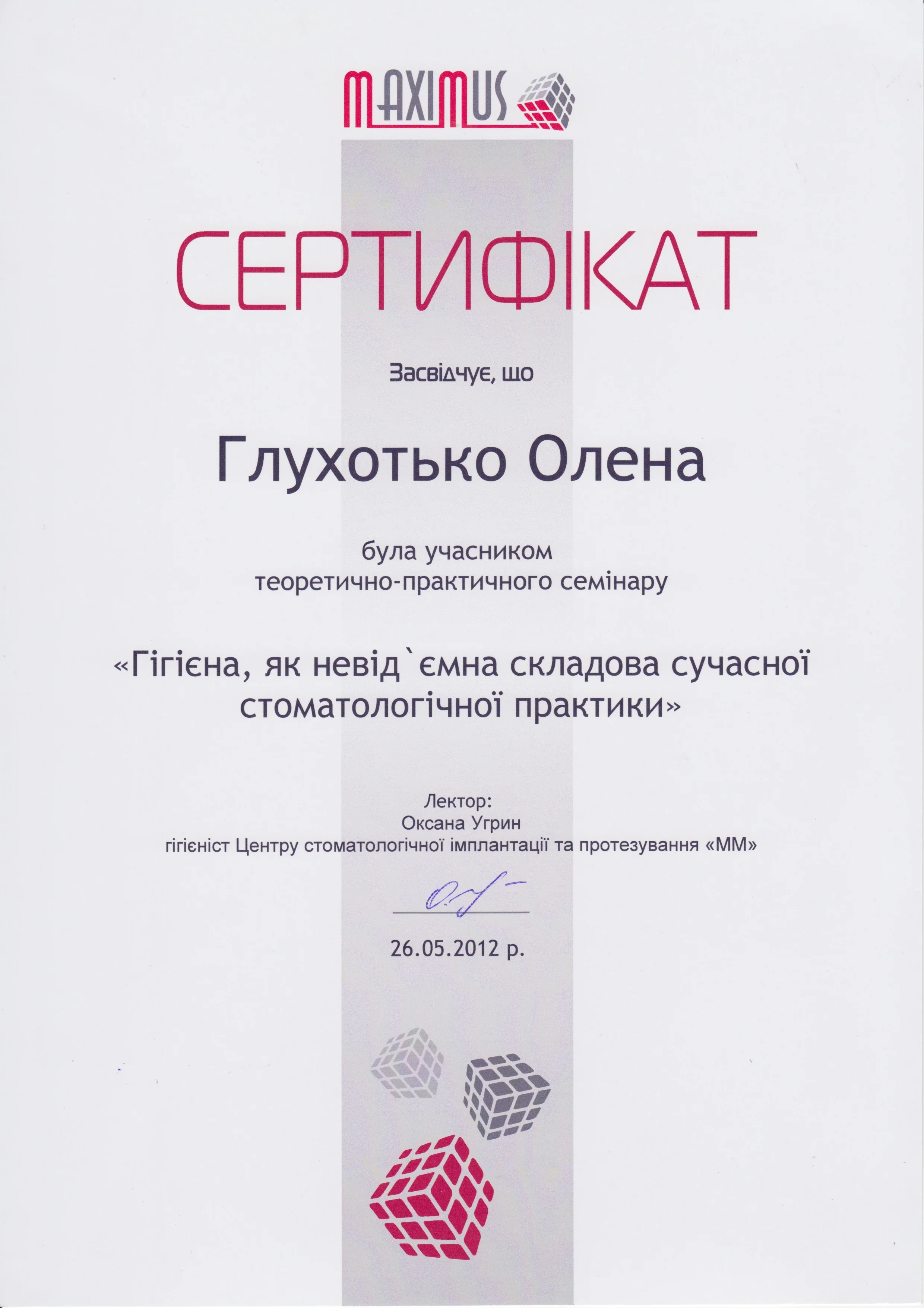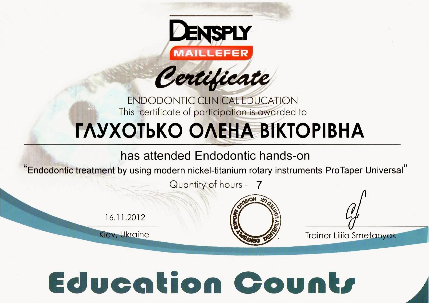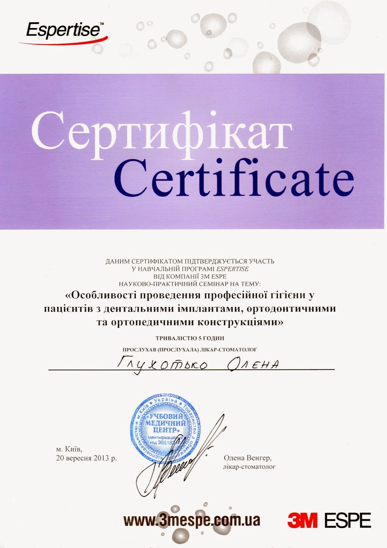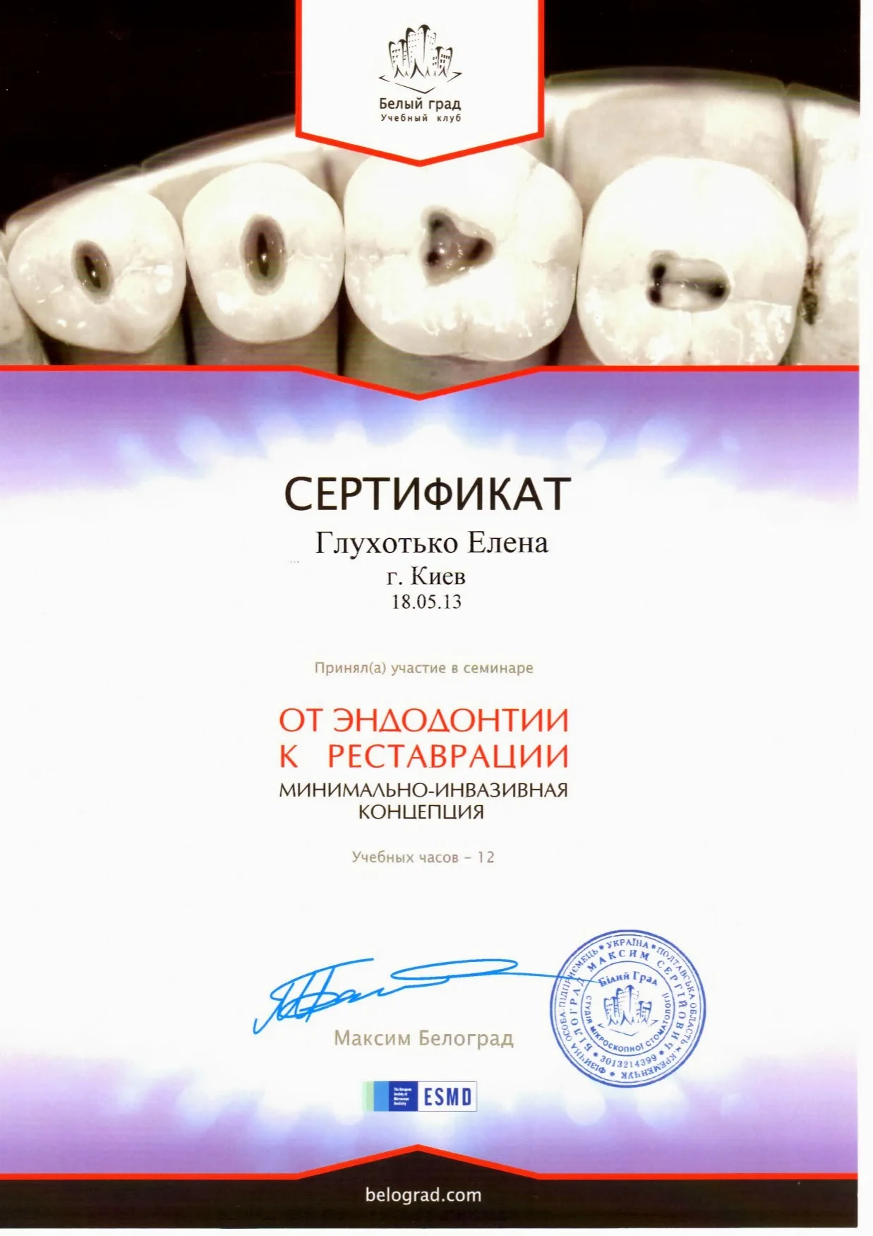 - Прошла интернатуру в Национальном медицинском университете им.А.А.Богомольца по специальности "Стоматология"