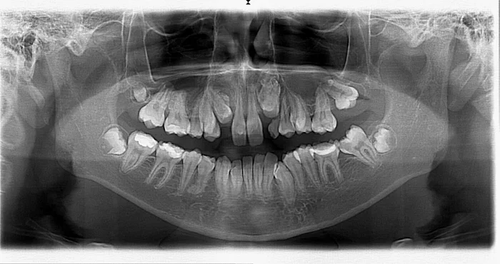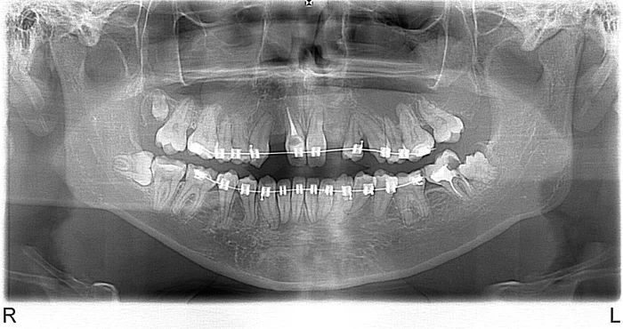 Фото: через некоторое время та же пациентка - в правом углу можно наблюдать, как зуб мудрости разрушает соседний зуб
