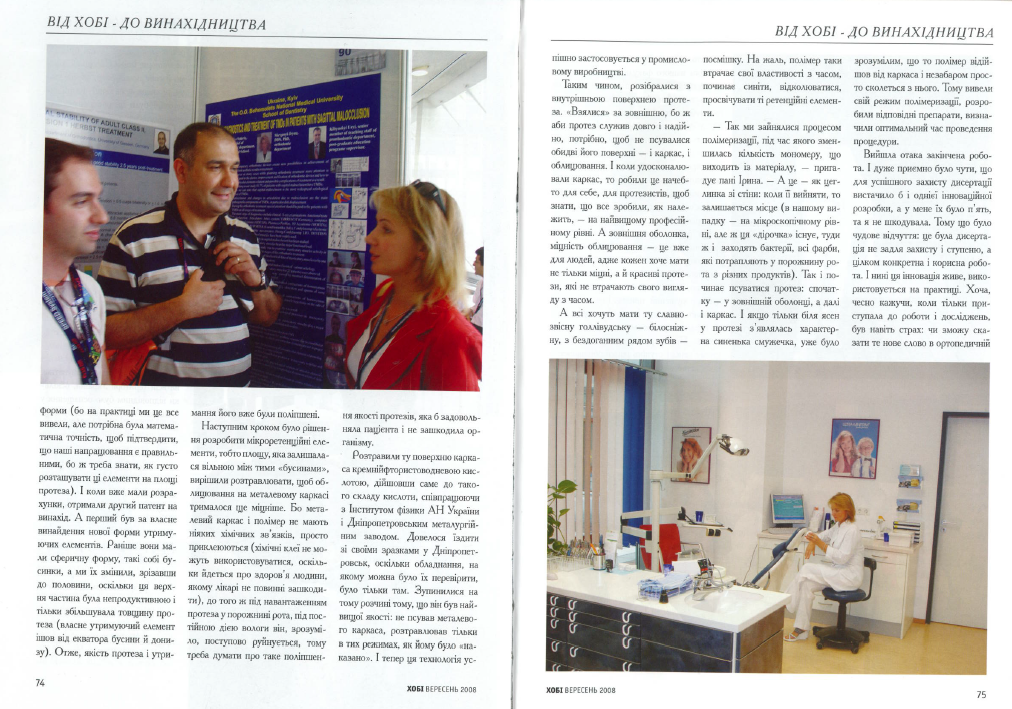 - Дуже приємно знати, що це ми, наша кафедра, запропонували ці нові технології вигoтовлення зубних протезів. На той час (дисертацію захистила у 2000 році, а писала їі близько чотирьох років) подібних технологій не було, кераміка ж рідко використовувалася. Тож основний наголос у дисертації зробила на використанні полімерних матеріалів, які були і менш дорогі, і могли використовуватися на всій території України, оскільки відповідним було оснащення у клініках. А керамічні печі були ще далеко не скрізь, тільки у великих центрах.