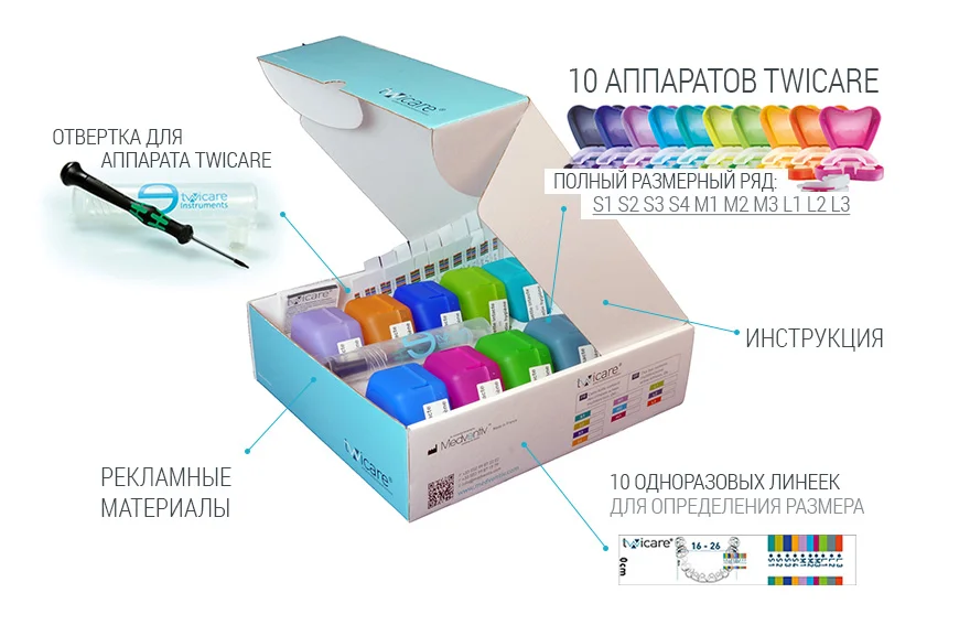 Twicare® поставляется в 10 размерах, пронумерованных от S1 до L3 и имеющих свою собственную систему цветовых идентификационных кодов. Каждому размеру аппарата соответствует бокс определённого цвета.
